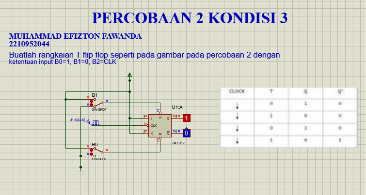 - Pada percobaan ini rangkaian dari T Flip Flop yang mana menggunakan J-K Flip-Flop yang kedua inputannya dihubungkan menjadi satu. Dapat dilihat bahwa B1 menuju ke kaki S dengan logika 0 sementara untuk kaki R dengan logika 1. Dan untuk J-K itu terhubung ke VCC sumber sehingga juga berlogika 1, untuk B2 itu dalam kondisi terhubung ke clock dimana karakteristik clock itu sendiri togle. Output yang didapat pada rangkaian ini adalah Q=1 Q'=0 , sesuai dengan tabel kebenaran ini merupakan kondisi Reset yaitu diulang atau dihapus ke nol.